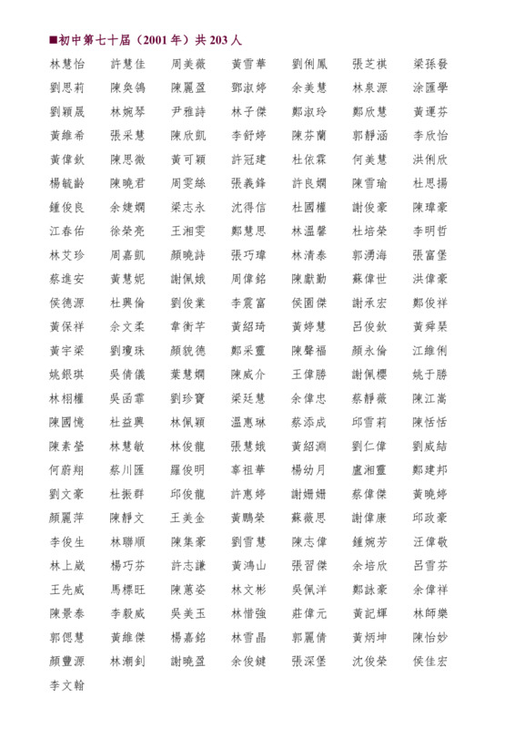 初中第70屆畢業生名錄