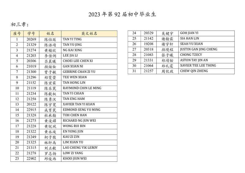 初中第92屆畢業生名錄