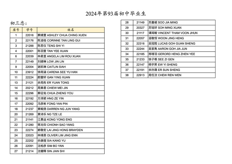 初中第93屆畢業生名錄